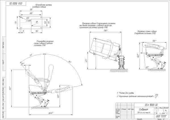 Сидение предназначено для установки в кабинах на мостовых, козловых, специальных кранах, на перегрузочных машинах для морских и речных портов и других площадках машинистов строительных и дорожных машинах.