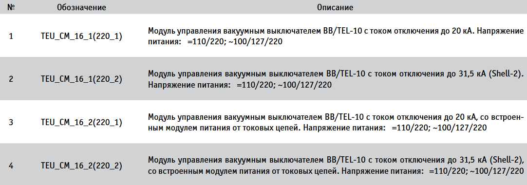 Модуль управления TEU_CM_16_2(220_2); вакуумным выключателем BB/TEL-10 с током отключения до 31,5 кА (Shell-2), со встроенным модулем питания от токовых цепей. Напряжение питания :