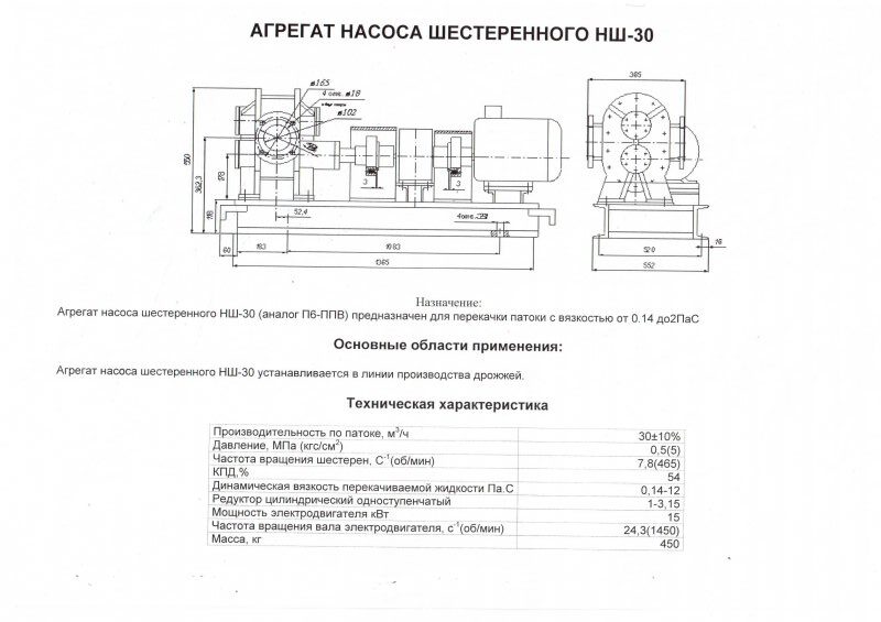 Насос П6-ППВ или НШ-30 — шестеренный пищевой насос для перекачки патоки, мелассы, мезги, сусла, карамели, лака, битума также может использоваться для перекачки любых других вязких жидкостей в пищевой, химической и других отраслях промышленности. Вязкость перекачиваемой жидкости от 0,14 до 12 ПаС. Самовсасывание — до 4 м.
